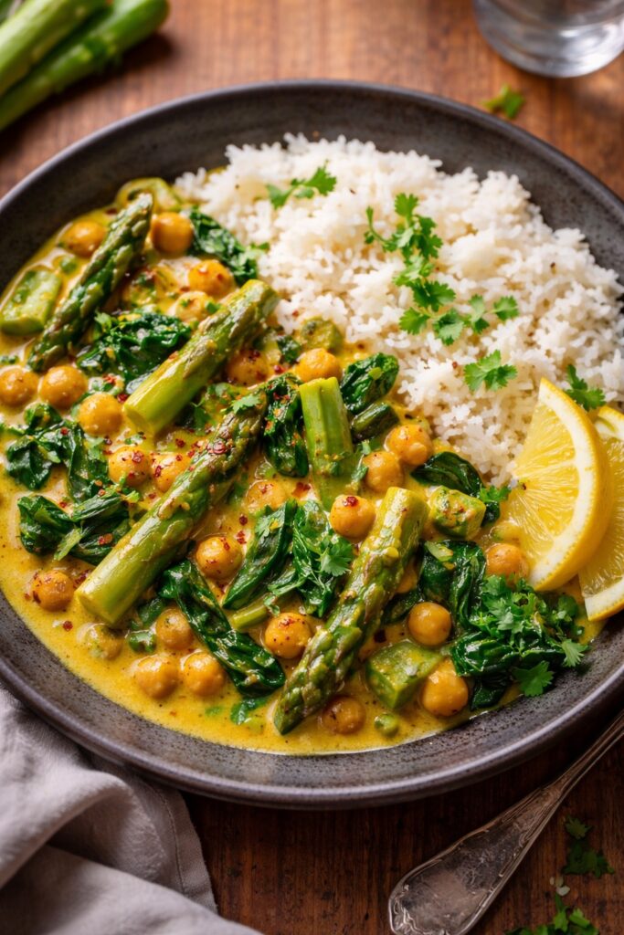 Spargel-Curry mit Spinat und Kichererbsen – leicht, warm und genau richtig für aktive Frühlingstage